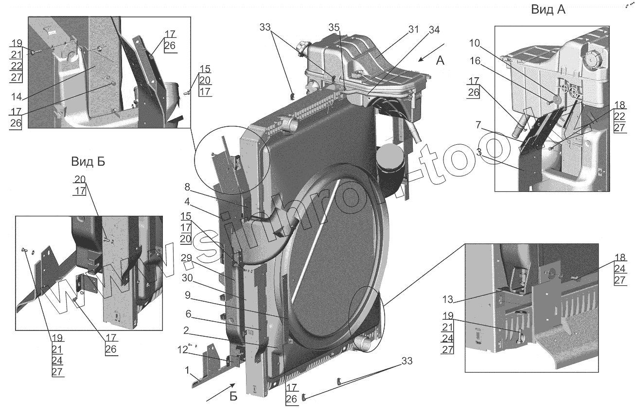 Каталог запасных частей к технике: МАЗ-643018. Радиатор с кожухом 544019-1301009