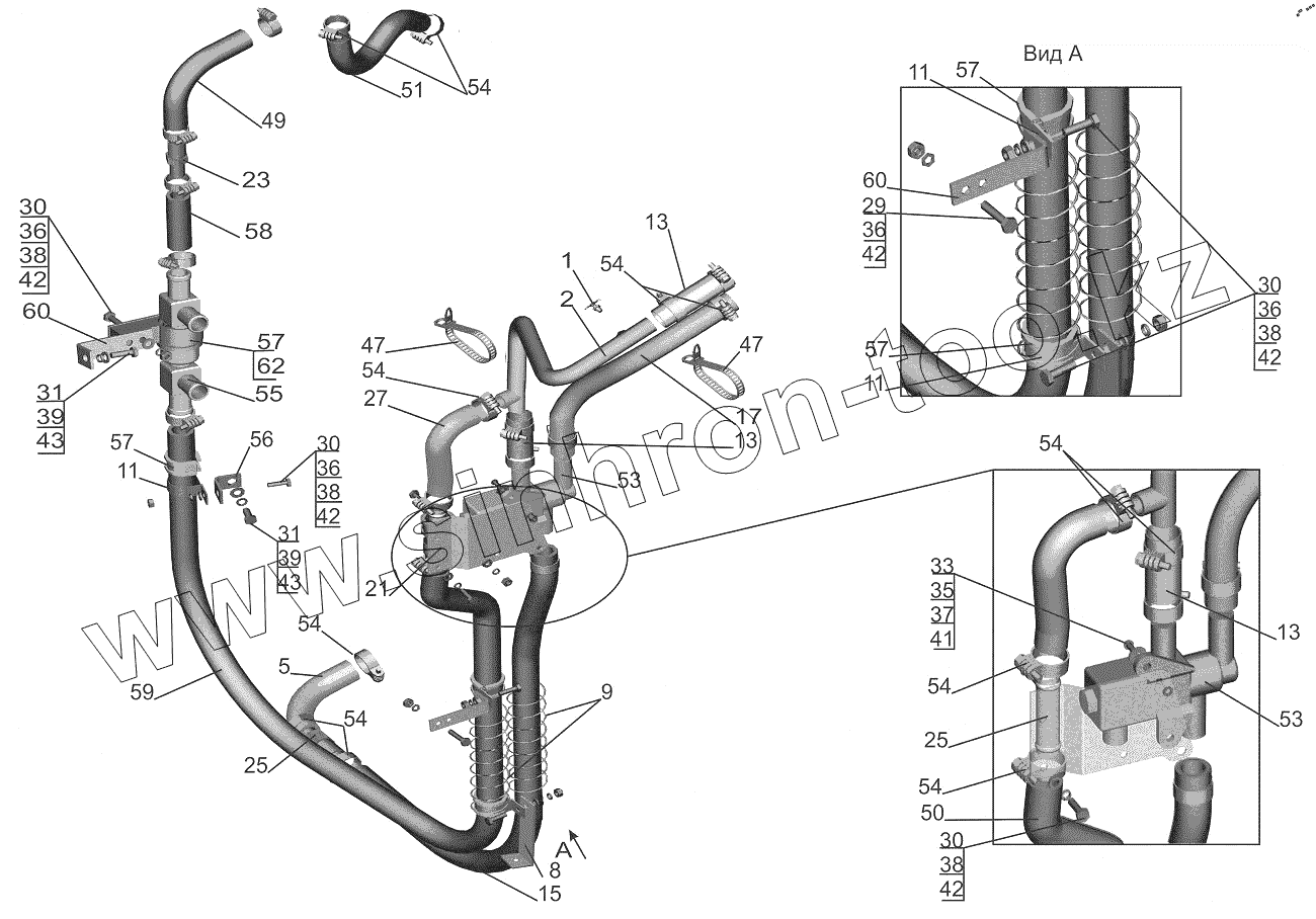 Каталог запасных частей к технике: МАЗ-643018. Установка шлангов отопителя 544019-8100006-030