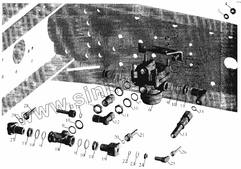 Каталог запасных частей к технике: МАЗ-643068. Установка ускорительного клапана и присоединительной арматуры