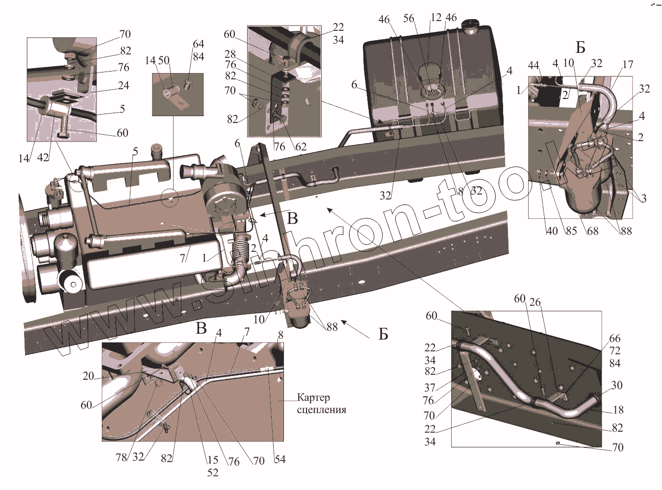 Каталог запасных частей к технике: МАЗ-650108. Крепление топливопроводов 650108-1104002-030