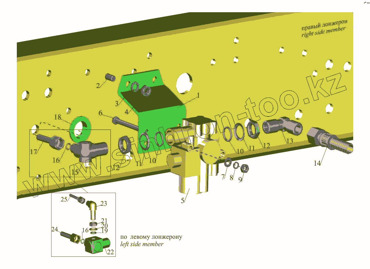 Каталог запасных частей к технике: МАЗ-650108. Установка передних модуляторов и присоединительной арматуры