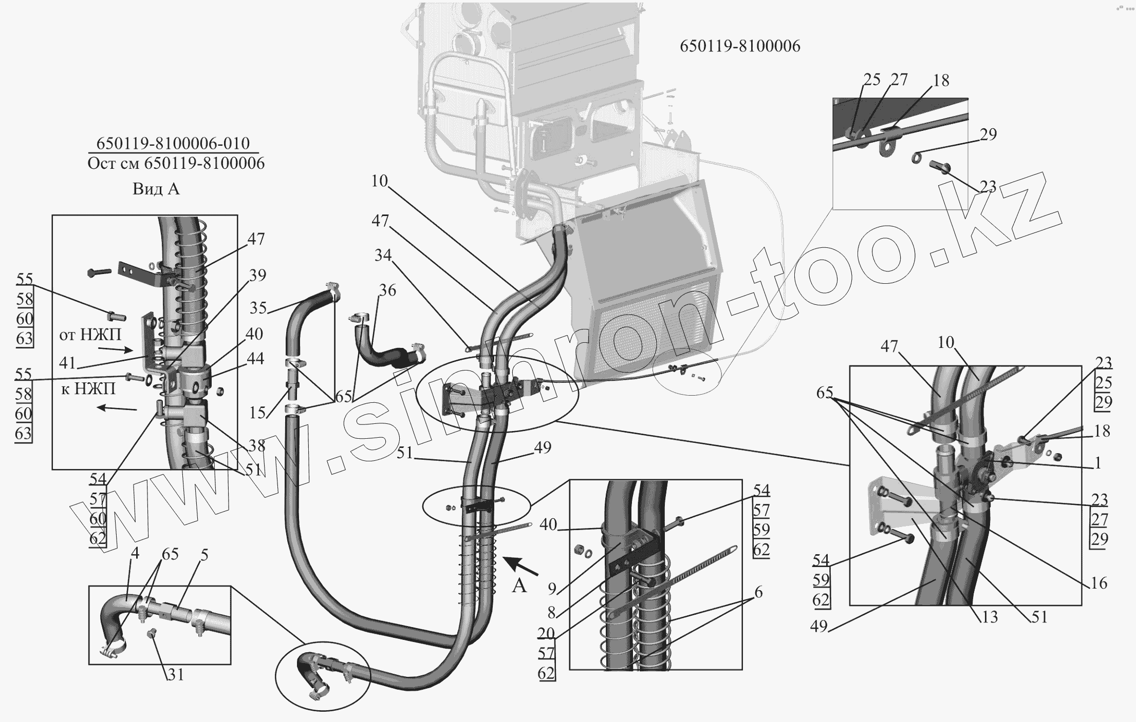 Каталог запасных частей к технике: МАЗ-650119. Установка шлангов отопителя