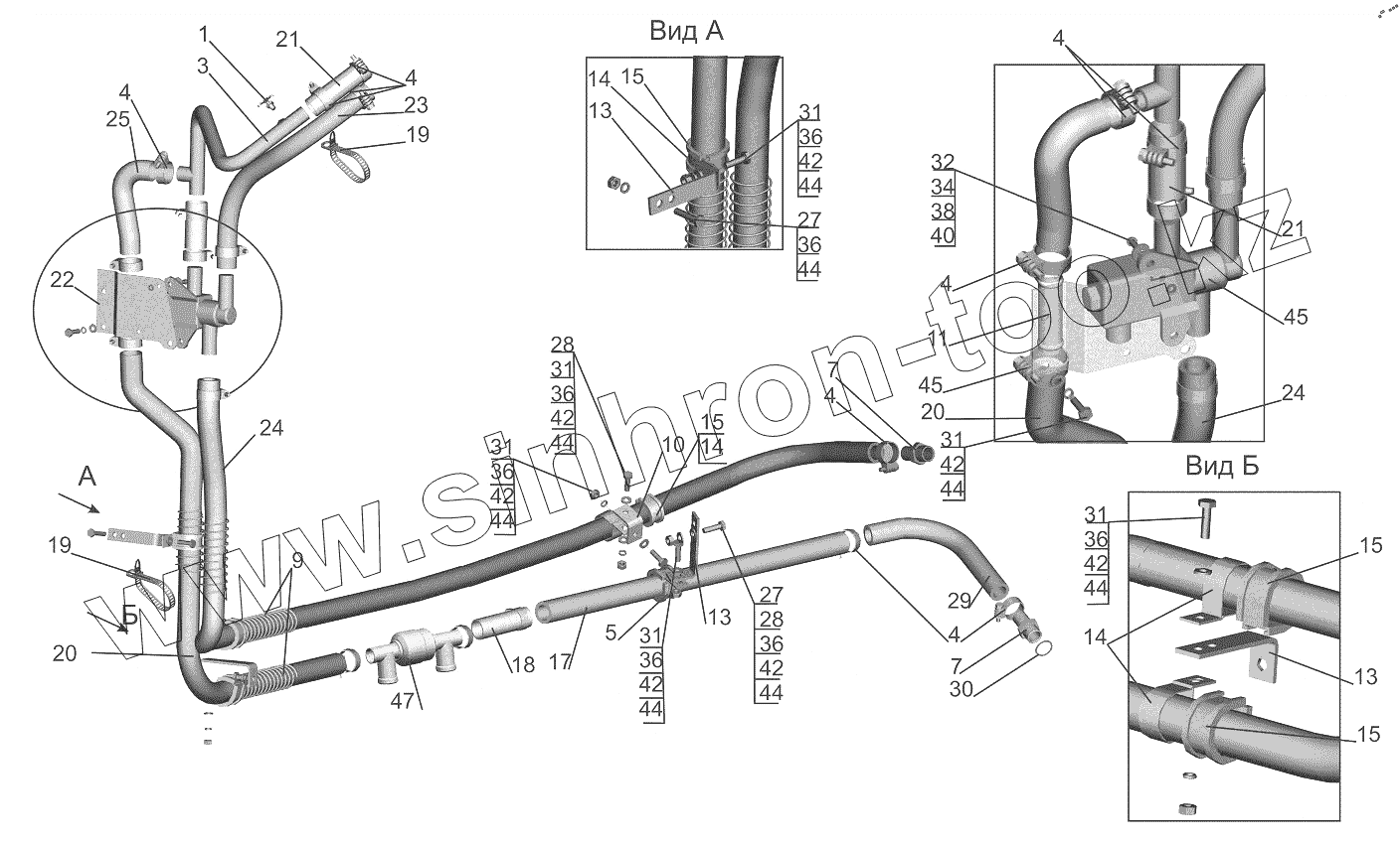 Каталог запасных частей к технике: МАЗ-6501B9. Установка шлангов отопителя 6501B9-8100006-030