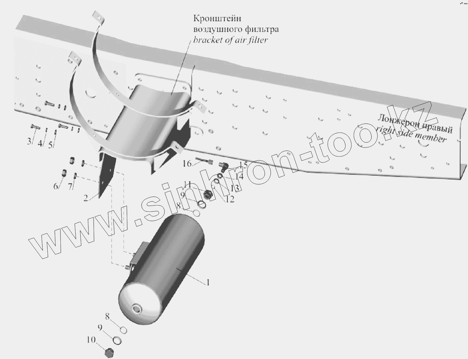 Каталог запасных частей к технике: МАЗ-651705. Крепление ресиверов 64255-3513004 и присоединительной арматуры