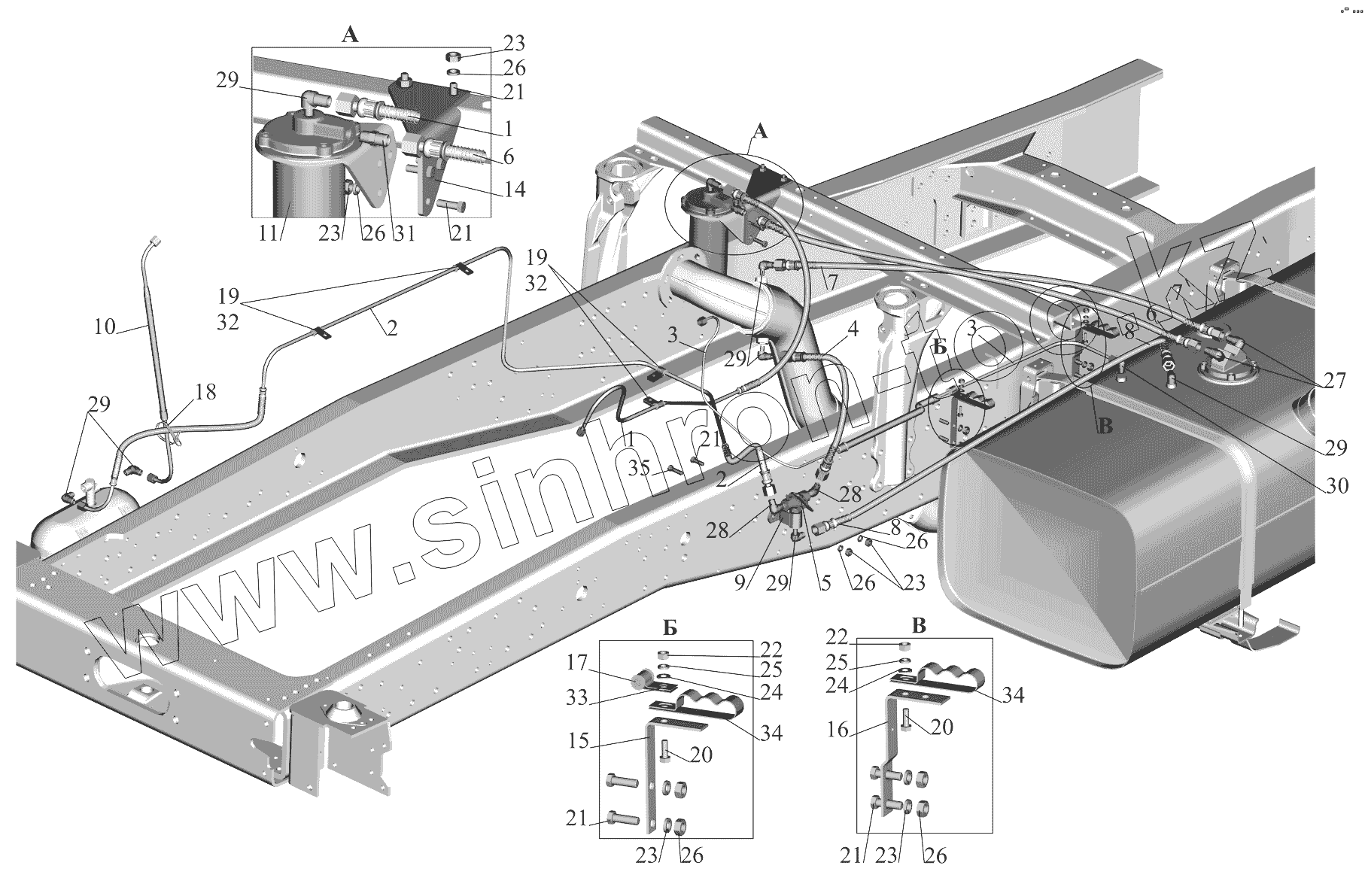 Каталог запасных частей к технике: МАЗ-651705. Крепление топливопроводов 651705-1104002-100