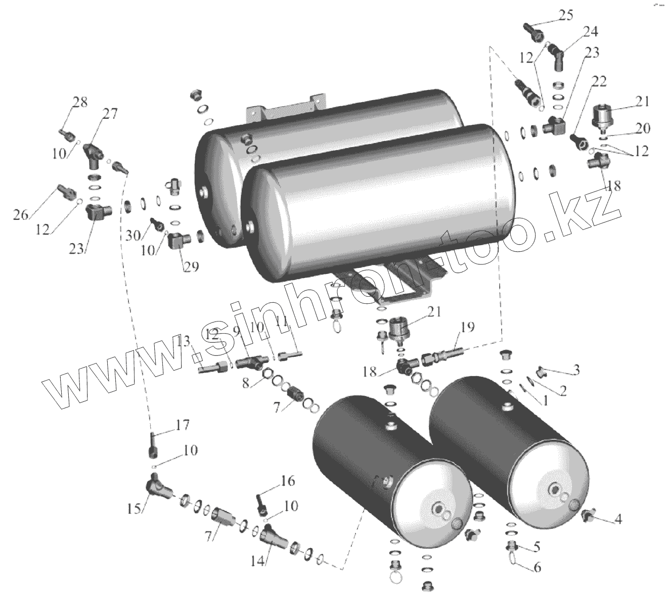 Каталог запасных частей к технике: МАЗ-651705. Установка присоединительной арматуры на ресиверах 551605-3513004