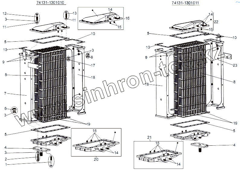 Каталог запасных частей к технике: МАЗ-74131. Радиатор 74131-1301010, 74131-1301011