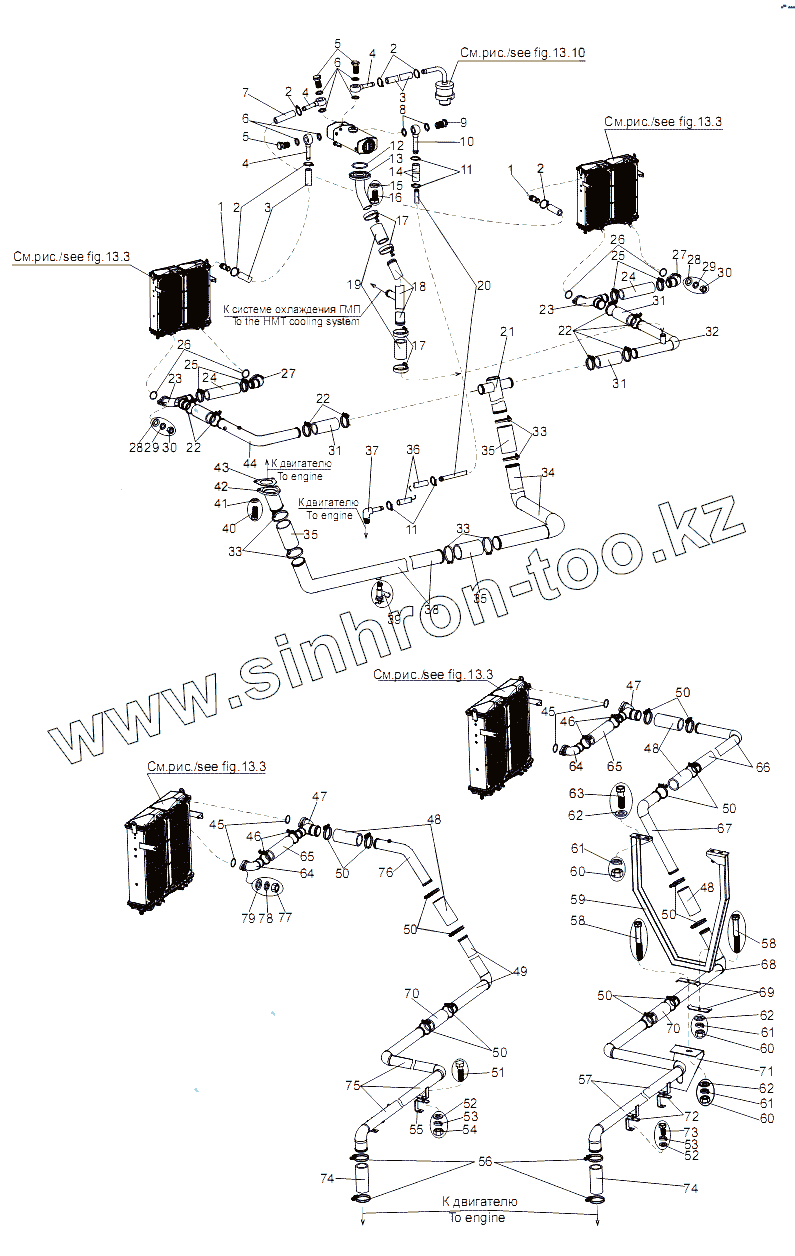 Каталог запасных частей к технике: МАЗ-74131. Установка трубопроводов системы охлаждения двигателя