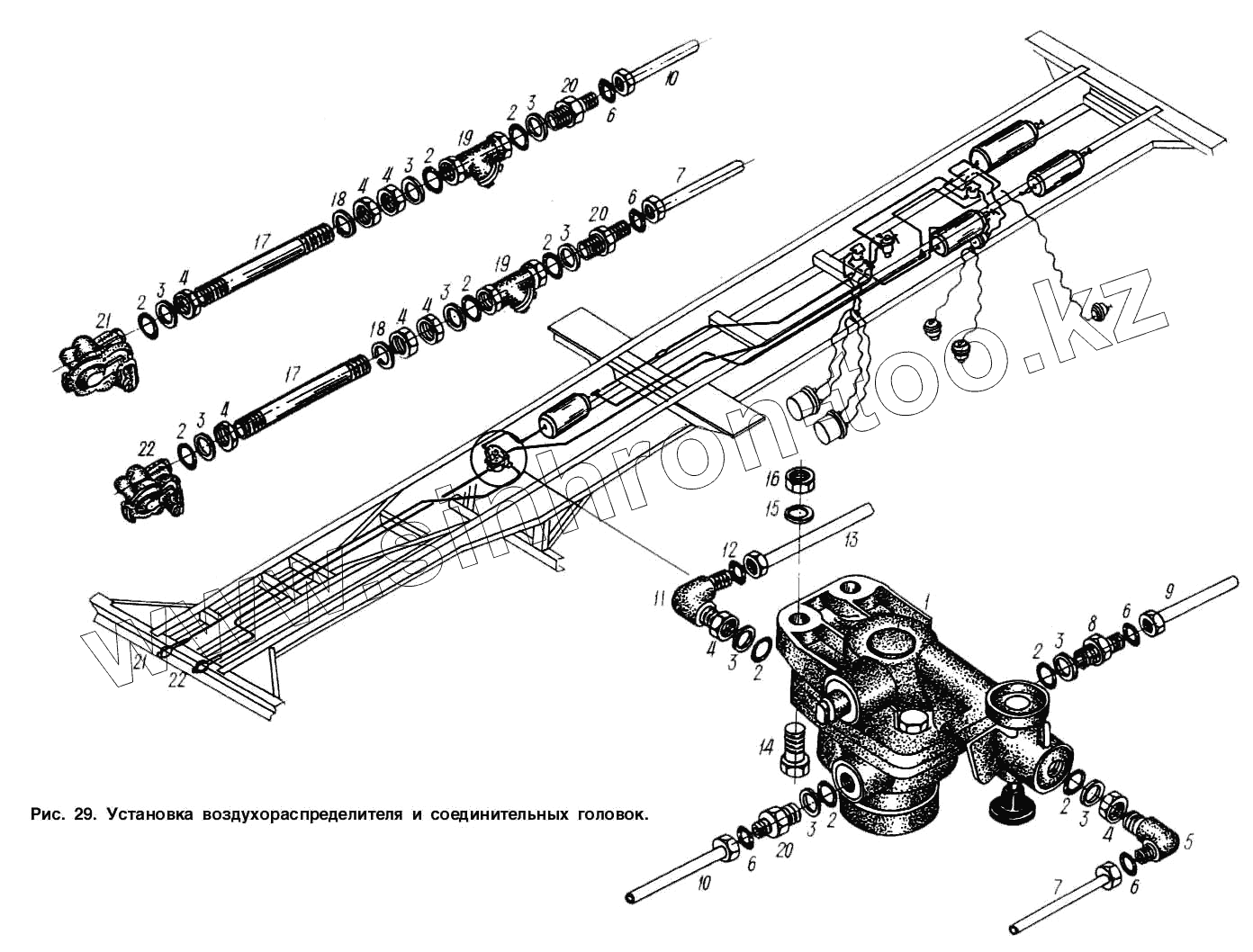 Каталог запасных частей к технике: МАЗ-93892. Установка воздухораспределителя и соединительных головок