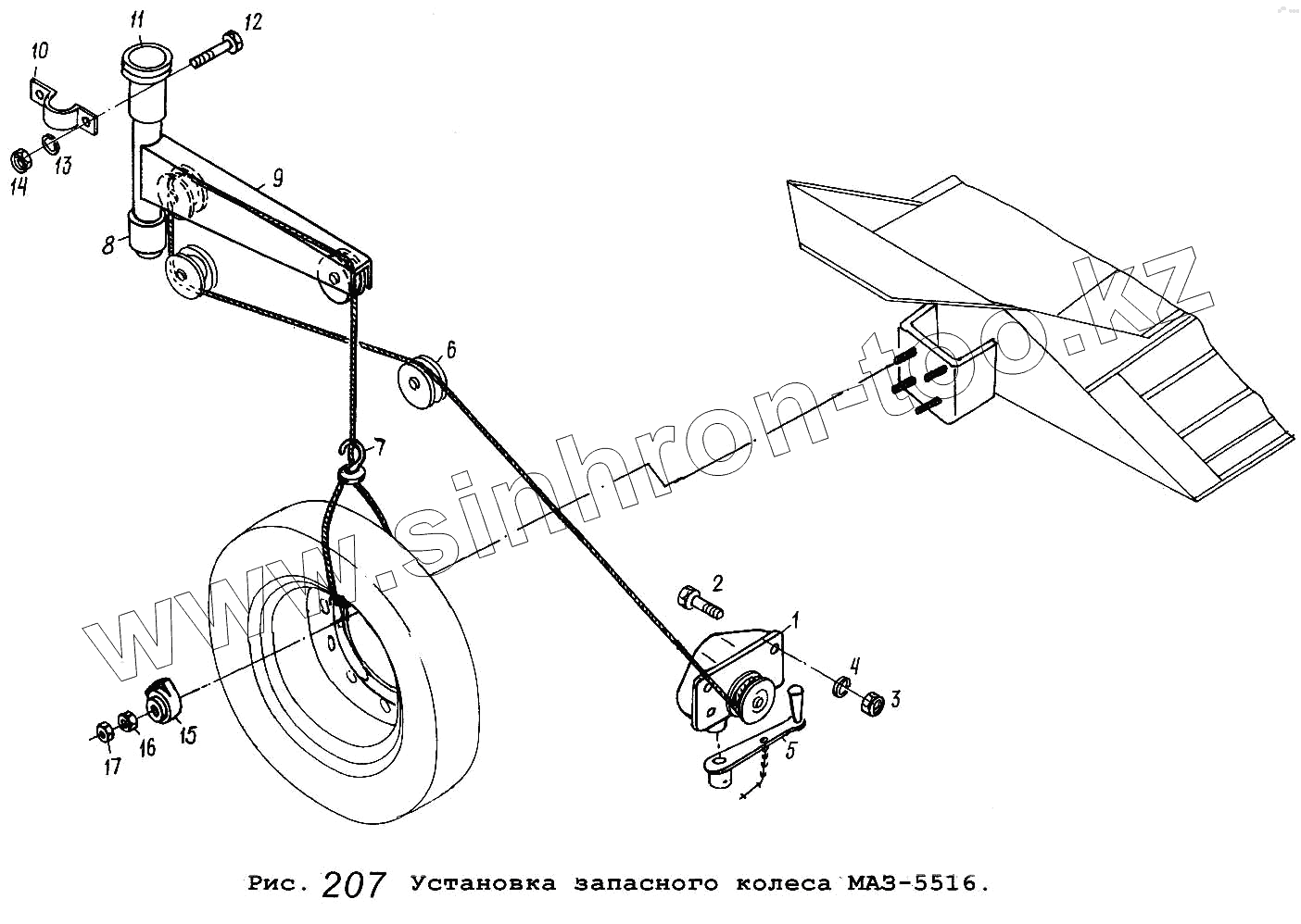Каталог запасных частей к технике: МАЗ Общий (см. мод-ции). Установка запасного колеса МАЗ-5516