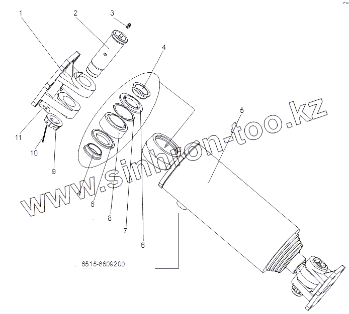 Каталог запасных частей к технике: МЗКТ-65151 "Волат". Гидроцилиндр с кронштейнами 6515-8603008-01