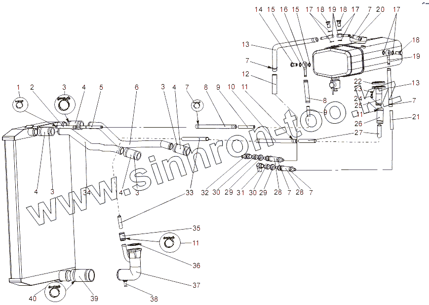 Каталог запасных частей к технике: МЗКТ-65151 "Волат". Установка трубопроводов системы охлаждения двигателя