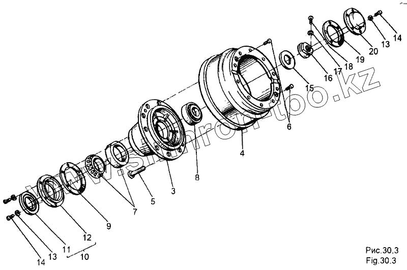 Каталог запасных частей к технике: МЗКТ-65158. Ступица с барабаном и подшипниками 6923-3103006