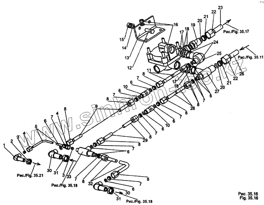 Каталог запасных частей к технике: МЗКТ-65158. Установка клапана ускорительного стояночного тормоза