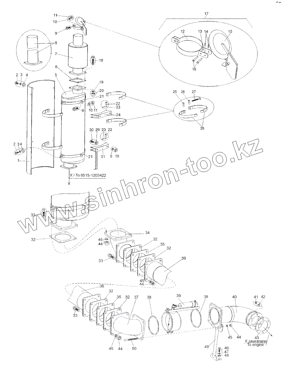 Каталог запасных частей к технике: МЗКТ-6527. Установка системы выпуска отработавших газов