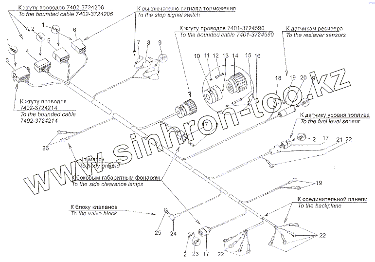 Каталог запасных частей к технике: МЗКТ-7401. Жгут проводов N2 по лонжерону 7402-3724580