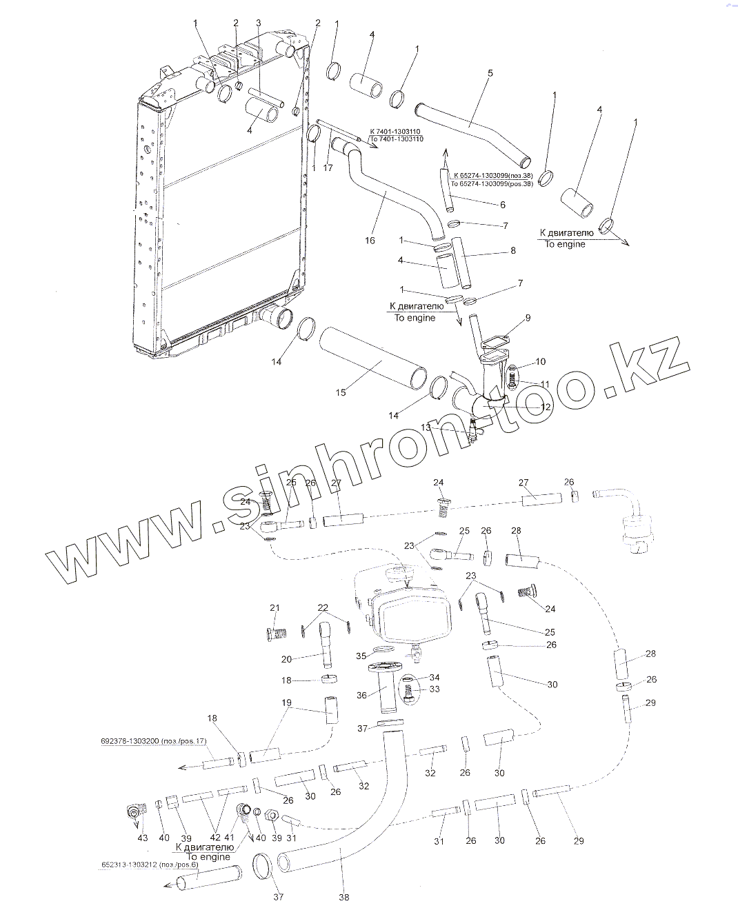 Каталог запасных частей к технике: МЗКТ-7402. Установка трубопроводов системы охлаждения двигателя