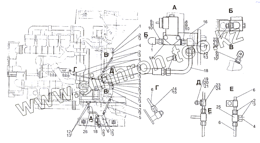 Каталог запасных частей к технике: МЗКТ-74296. Установка трубопроводов моторного тормоза