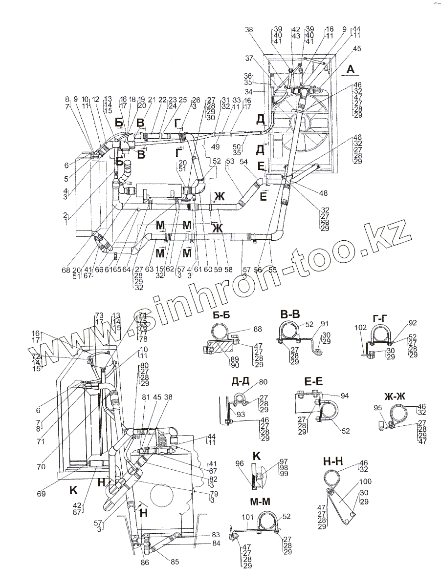 Каталог запасных частей к технике: МЗКТ-74296. Установка трубопроводов системы охлаждения