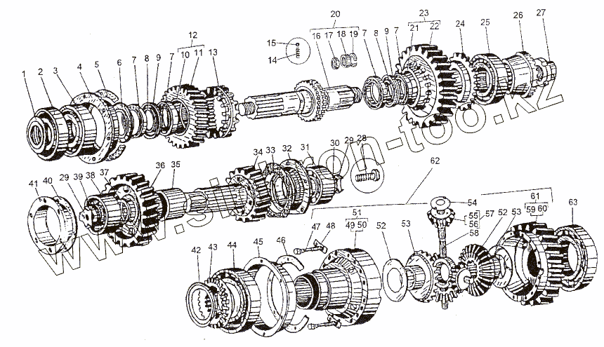 Каталог запасных частей к технике: МЗКТ-74296. Валы и шестерни раздаточной коробки