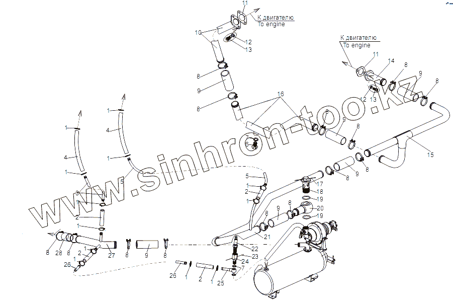Каталог запасных частей к технике: МЗКТ-79092 (нов.). Установка трубопроводов системы подогрева двигателя