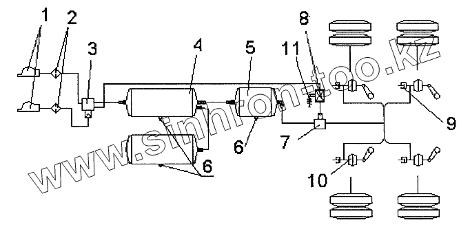 Каталог запасных частей к технике: Нефтекамский автозавод НефАЗ-9334. Привод пневматический тормозов (схема)