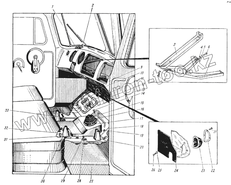 Каталог запасных частей к технике: УралАЗ УРАЛ-375. Кабина автомобиля (вид изнутри) (Рис. 137)