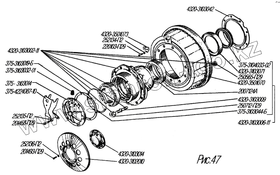 Каталог запасных частей к технике: УралАЗ УРАЛ-4320-31. Ступица колеса и тормозной барабан