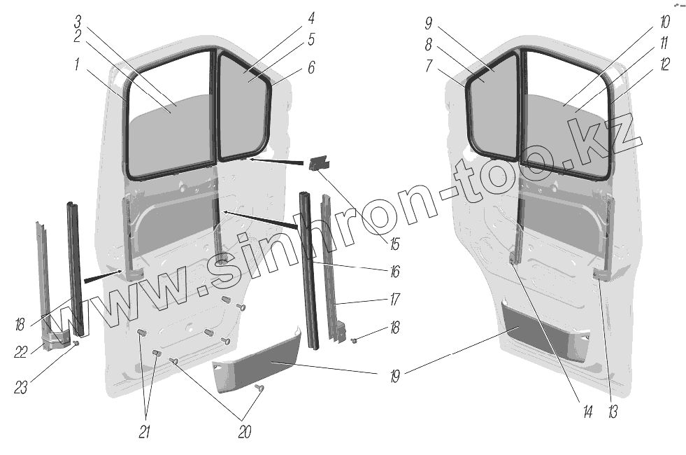 Каталог запасных частей к технике: УралАЗ УРАЛ-4320-6951-74. Установка деталей двери
