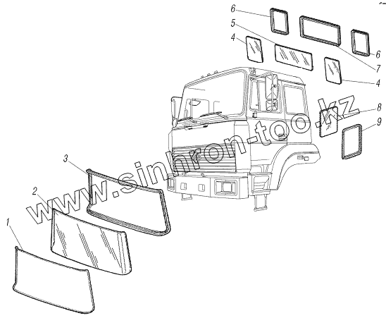 Каталог запасных частей к технике: УралАЗ УРАЛ-44202-3511-80. Стекла кабины
