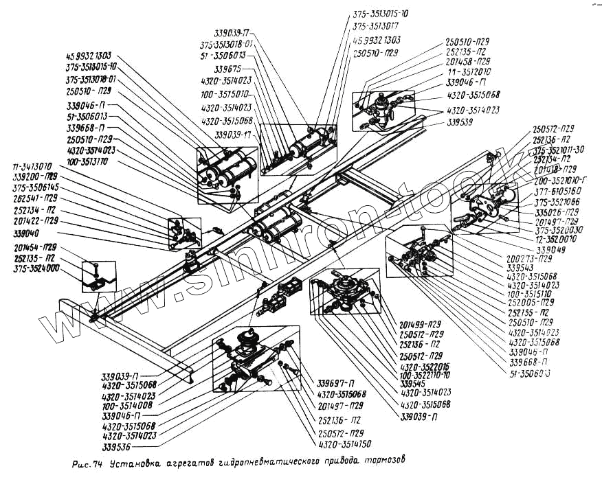 Каталог запасных частей к технике: УралАЗ УРАЛ-5557. Установка агрегатов гидропневматического привода тормозов
