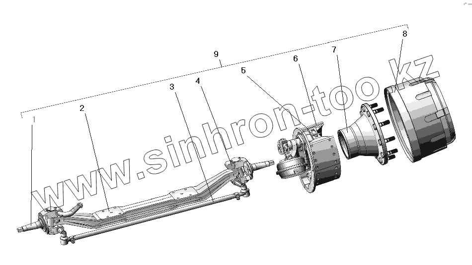 Каталог запасных частей к технике: УралАЗ УРАЛ-63674. Ось передняя со ступицей и тормозом