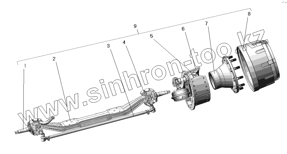 Каталог запасных частей к технике: УралАЗ УРАЛ-63685. Ось передняя со ступицей и тормозом
