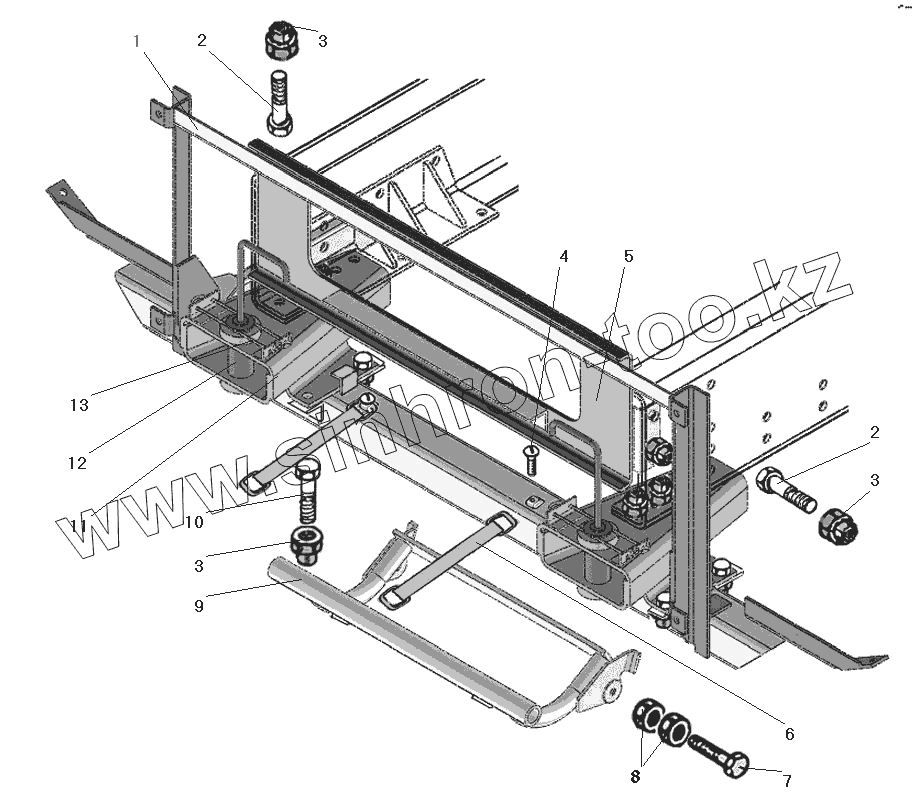Каталог запасных частей к технике: УралАЗ УРАЛ-63685. Установка передней буксирной поперечины и каркас буфера