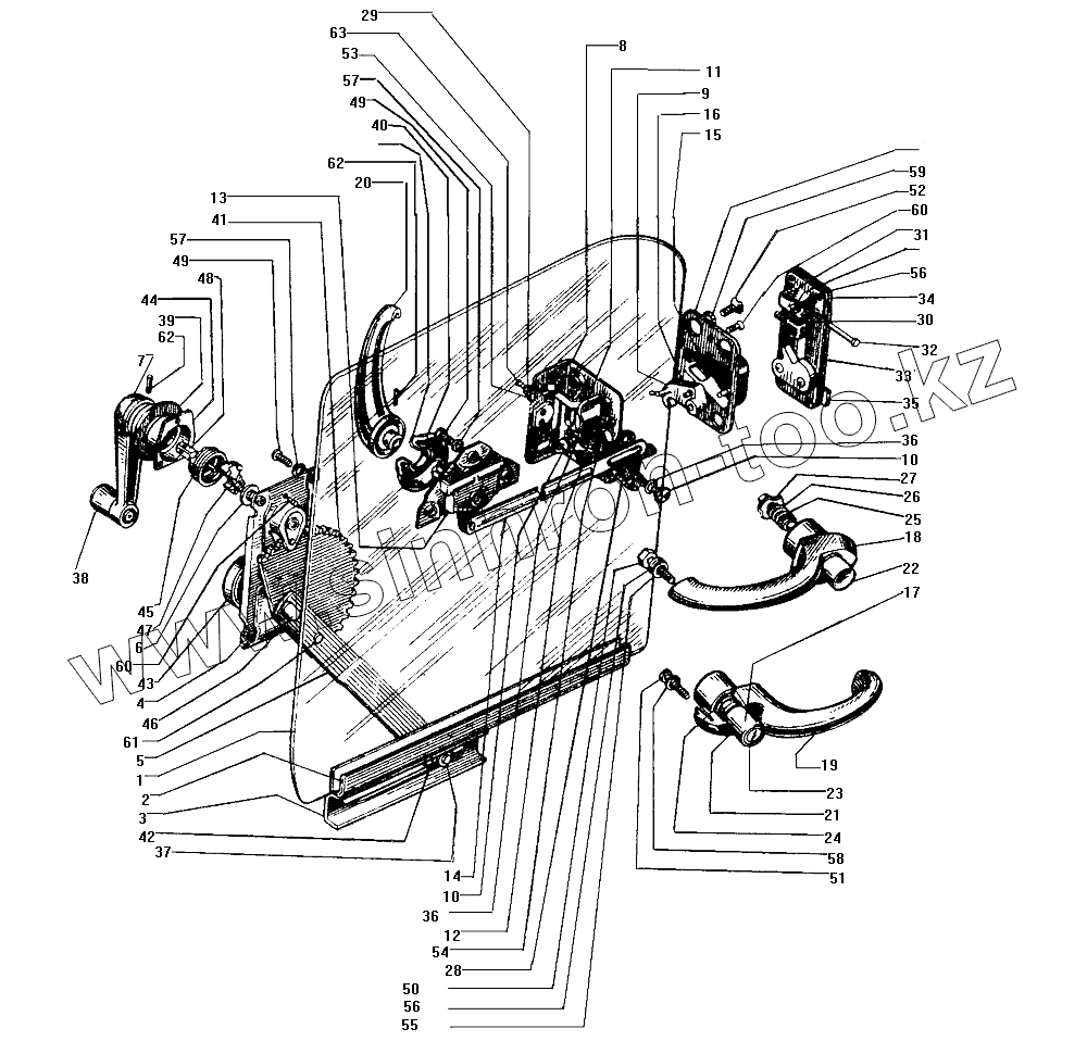 Каталог запасных частей к технике: ЗИЛ-130. Замок, ручки и стеклоподъемник двери