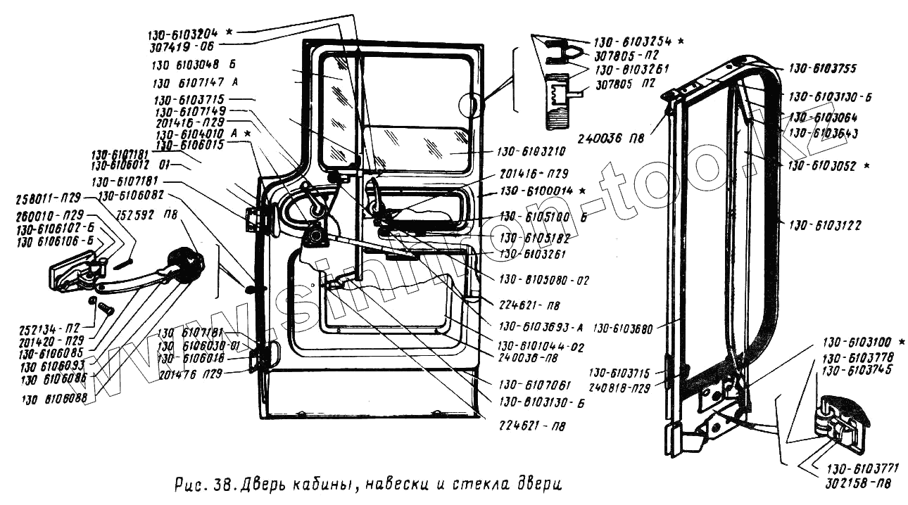 Каталог запасных частей к технике: ЗИЛ-431410 (130). Дверь кабины, навески и стекла двери