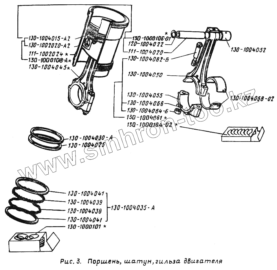 Каталог запасных частей к технике: ЗИЛ-431410 (130). Поршень, шатун, гильза двигателя