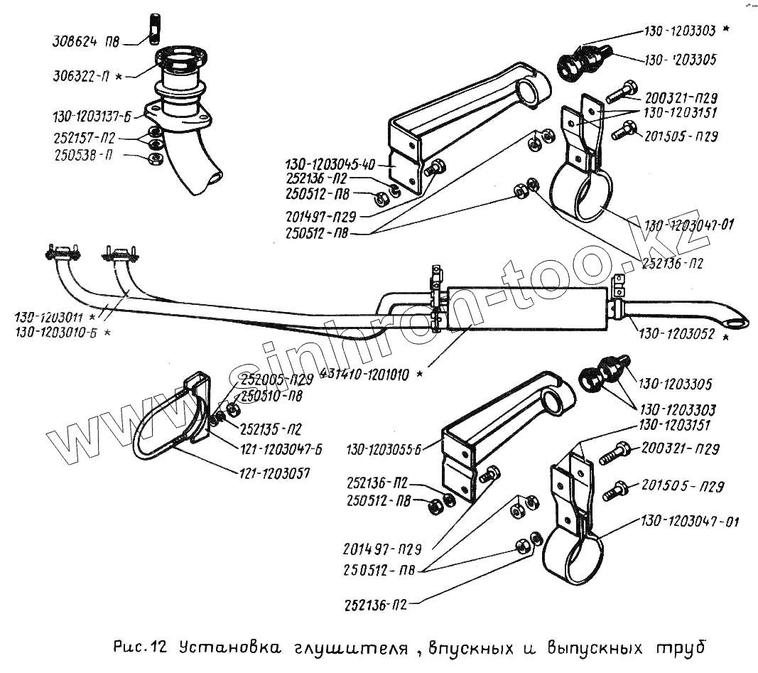 Каталог запасных частей к технике: ЗИЛ-431410 (130). Установка глушителя, впускных и выпускных труб
