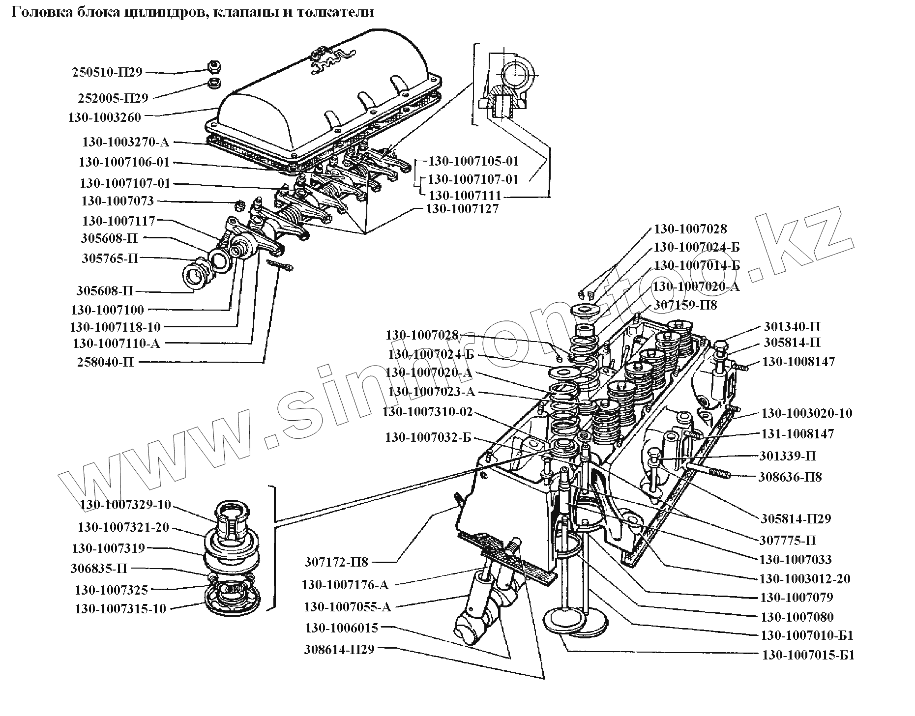 Каталог запасных частей к технике: ЗИЛ-431416. Двигатель\Головка блока цилиндров, клапаны и толкатели