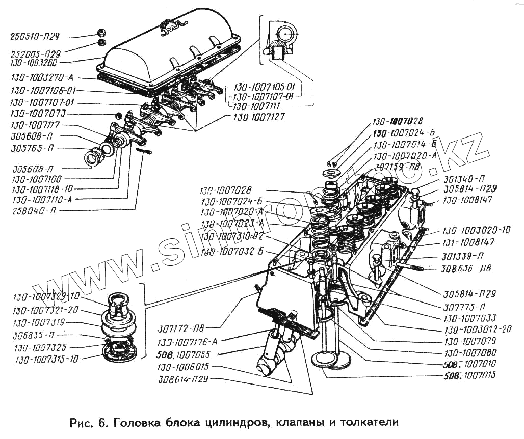 Каталог запасных частей к технике: ЗИЛ-494560. Головка блока цилиндров, клапаны и толкатели