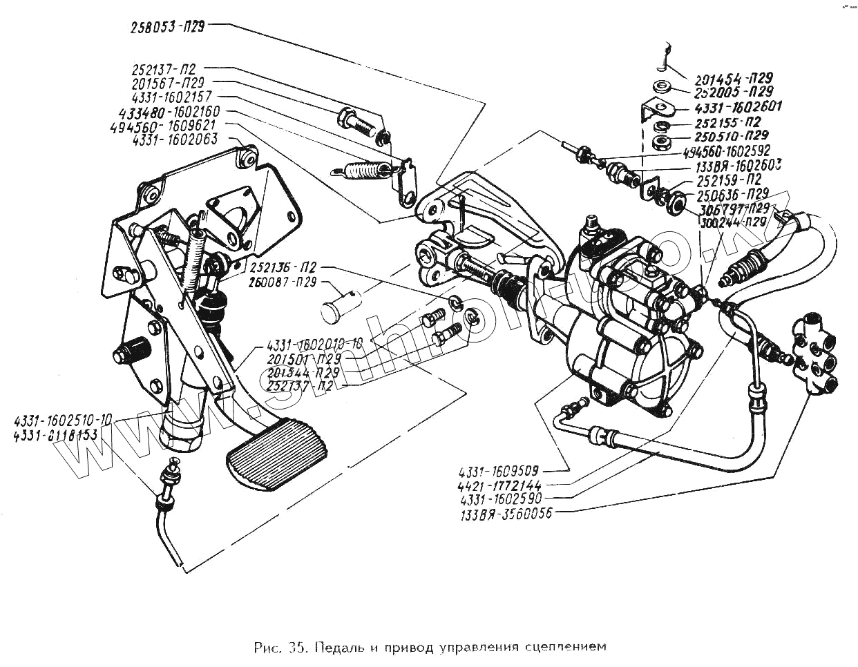 Каталог запасных частей к технике: ЗИЛ-494560. Педаль и привод управления сцеплением