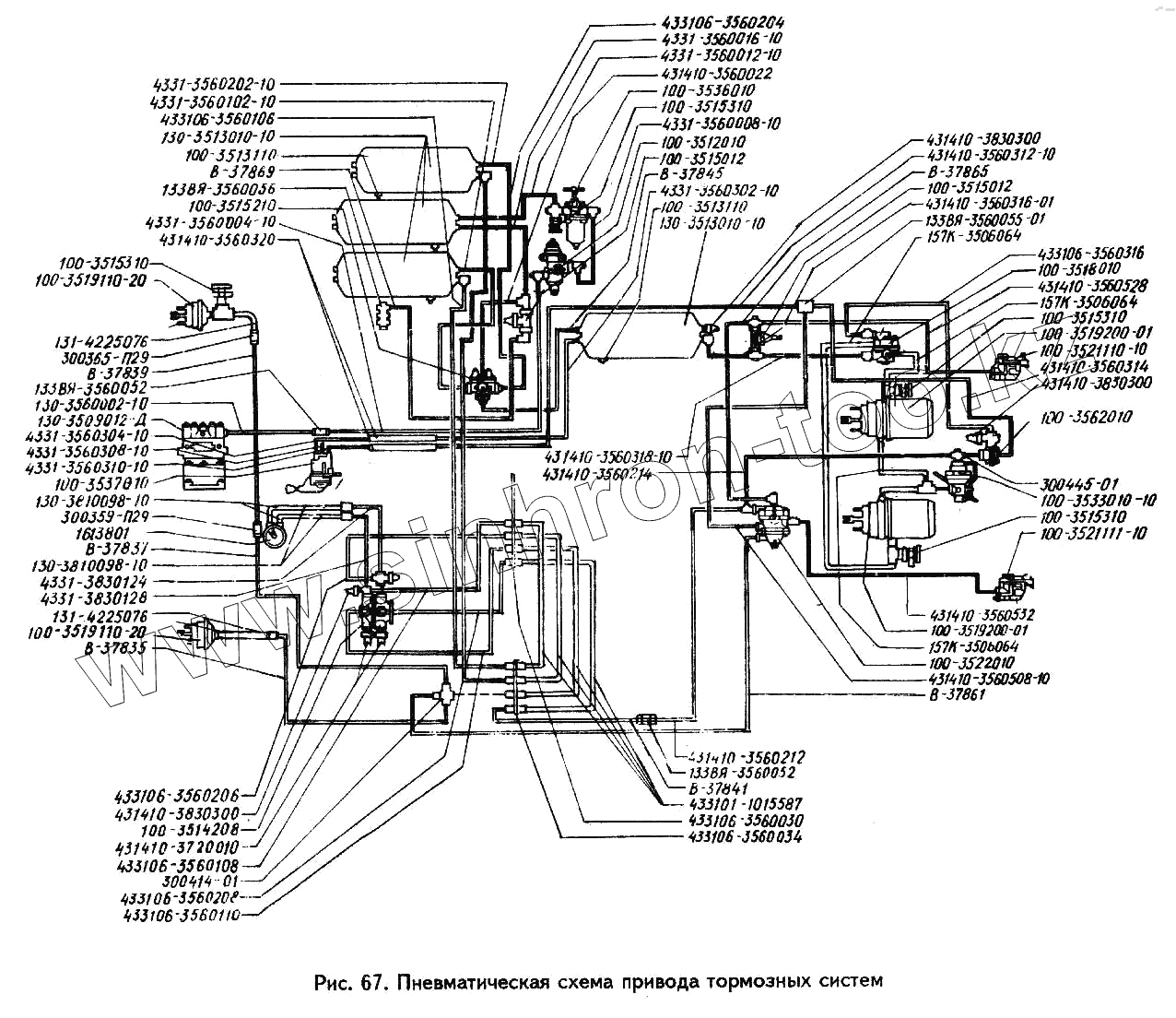 Каталог запасных частей к технике: ЗИЛ-494560. Пневматическая схема привода тормозных систем