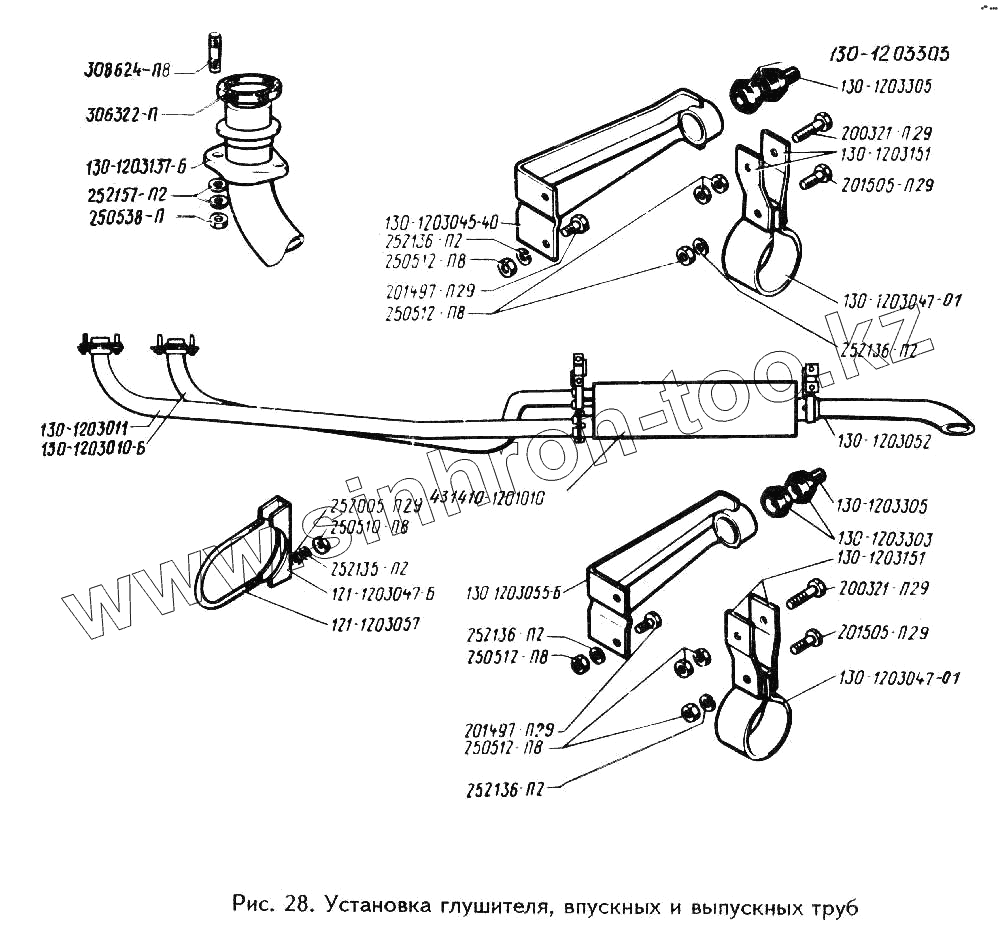 Каталог запасных частей к технике: ЗИЛ-494560. Установка глушителя, впускных и выпускных труб