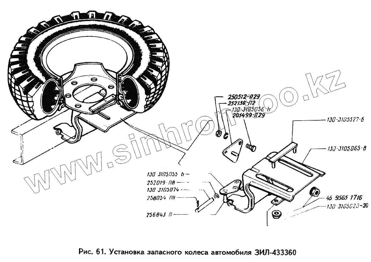 Каталог запасных частей к технике: ЗИЛ-494560. Установка запасного колеса автомобиля ЗИЛ-433360