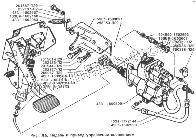 Каталог запасных частей к технике: ЗИЛ-5301. Педаль и привод управления сцеплением