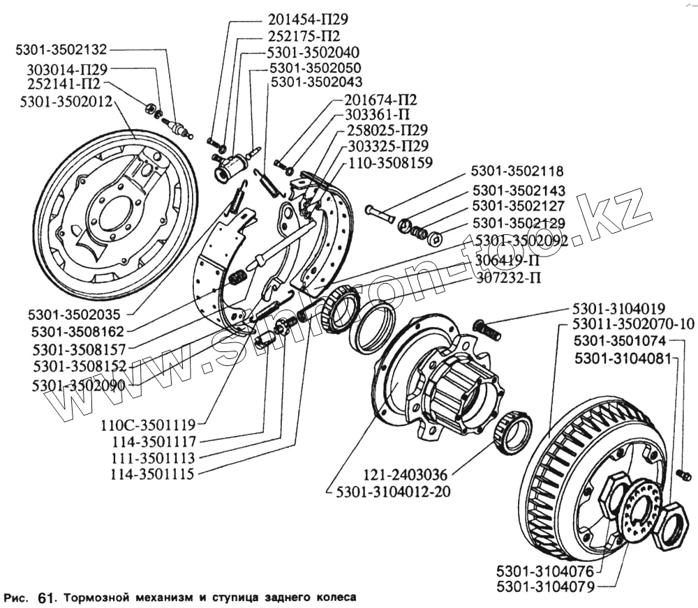 Каталог запасных частей к технике: ЗИЛ-5301. Тормозной механизм и ступица заднего колеса