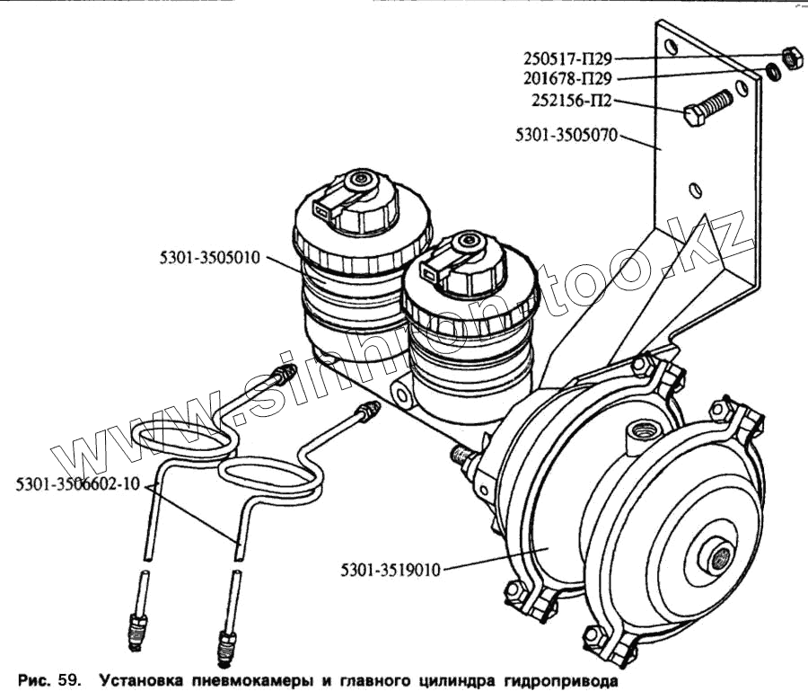 Каталог запасных частей к технике: ЗИЛ-5301. Установка пневмокамеры и главного цилиндра гидропривода
