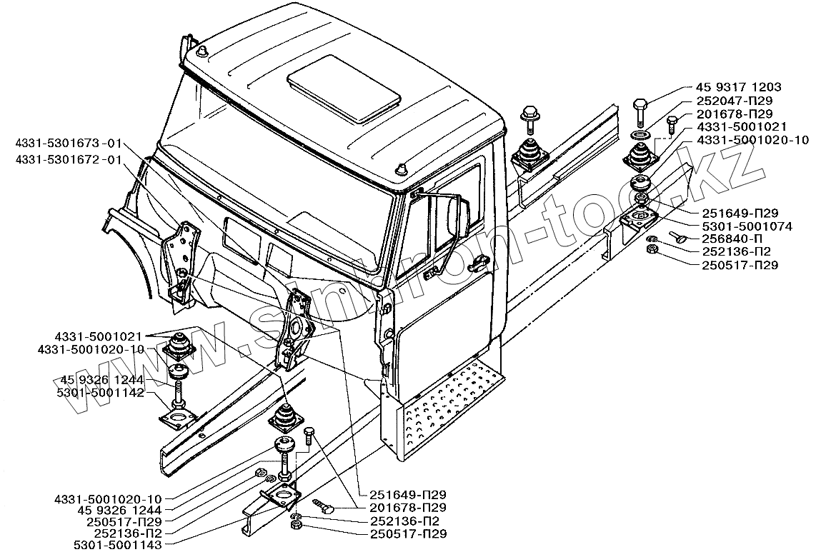 Каталог запасных частей к технике: ЗИЛ-5301 (2006). Крепление кабины автомобиля ЗИЛ-5301