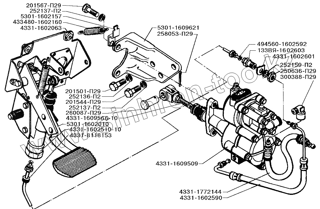 Каталог запасных частей к технике: ЗИЛ-5301 (2006). Педаль и привод управления сцеплением