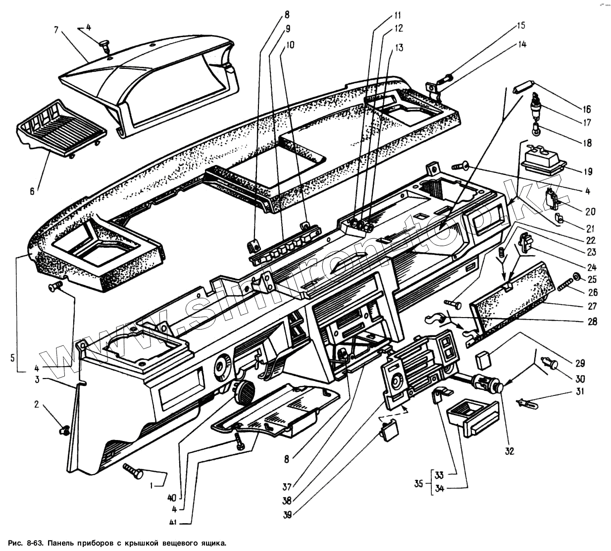 Каталог запасных частей к технике: АЗЛК Москвич-2141. Панель приборов с крышкой вещевого ящика
